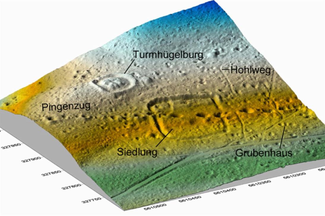 - Im Höhenmodell des Laserscans gleicht das Bergbaudenkmal Hohenforst der Mondoberfläche. Es wird dominiert durch den markanten Pingenzug, den Umfassungsgraben der Siedlund und eine Turmhügelburg. (JPG; 2 MB)