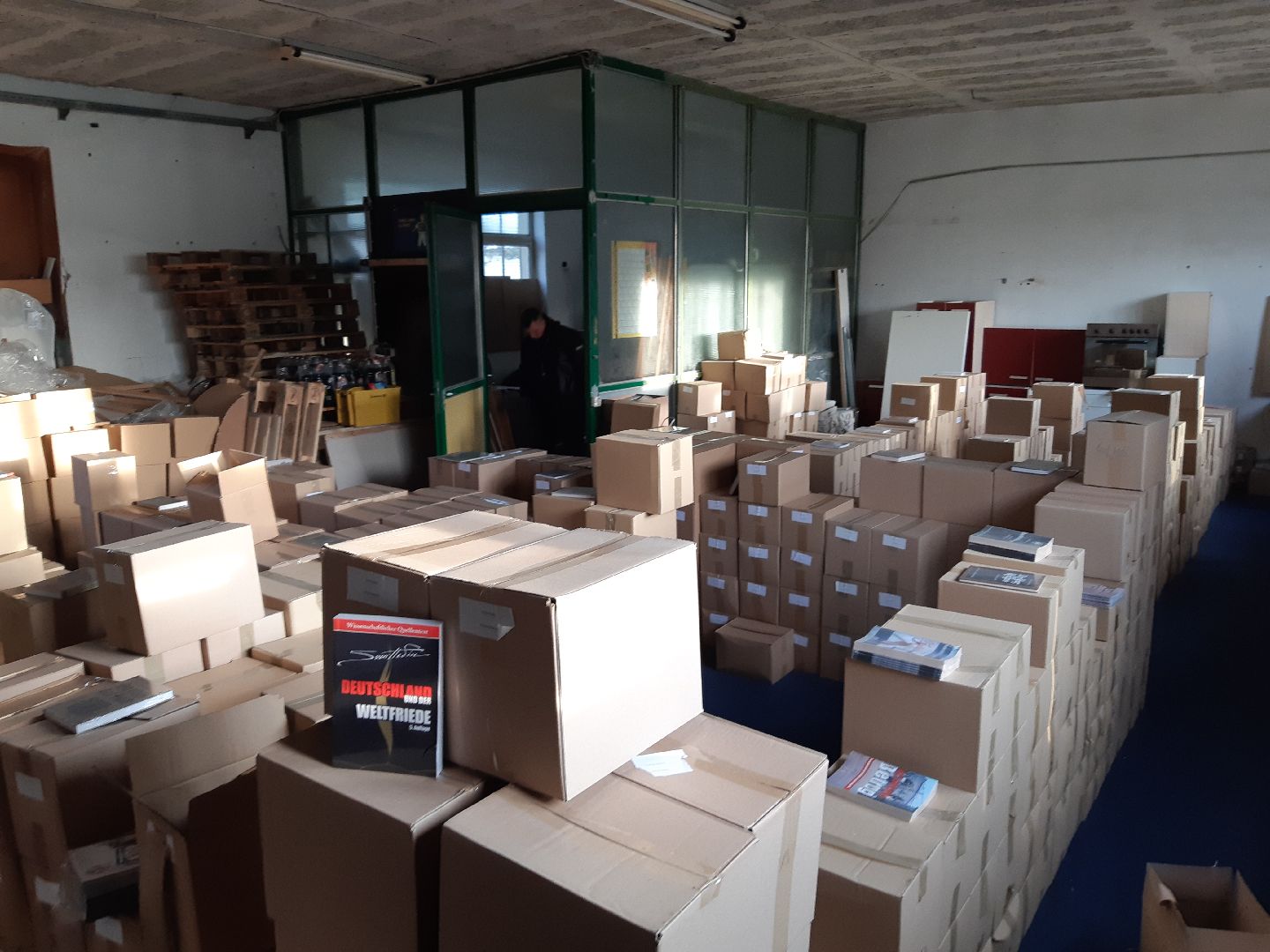 Bei den Durchsuchungen von mehreren Geschäfts- und Lagerräumen sowie zwei Wohnungen konnte umfangreiches Beweismaterial, unter anderem versandfertige Bücher und elektronische Speichermedien, sichergestellt werden. In einer Lagerhalle im Landkreis Leipzig wurden auf ca. 80 Euro-Paletten in einer Vielzahl von Paketen mehrere tausend Bücher mit strafrechtlich relevanten, bzw. indizierten Publikationen aus dem Verlagsprogramm beschlagnahmt. Unter diesen befanden sich auch zahlreiche unkommentierte Nachdrucke des Buchs »Mein Kampf« von Adolf Hitler. Aufgrund des Umfangs der Sicherstellungen dauert die Erfassung der Gesamtzahl der Bücher und die Ermittlung von deren Verkaufswert noch an.