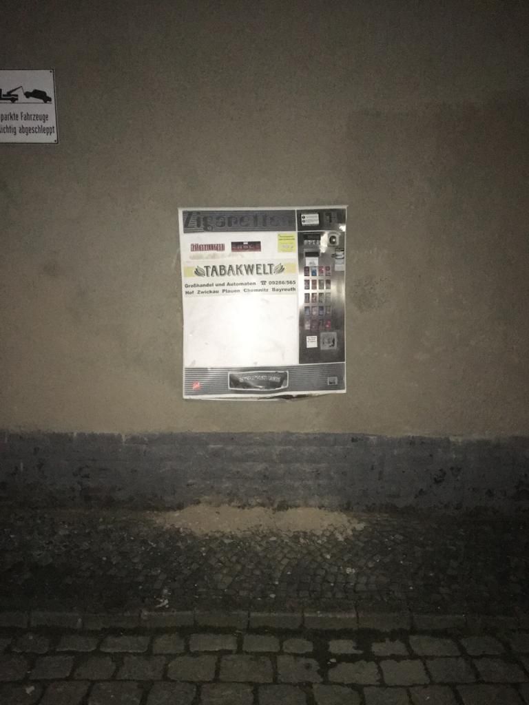 In der Nacht zum Freitag sprengten Unbekannte einen Zigarettenautomaten an der Thomas-Müntzer-Straße (Bild angehängt). Dabei entstand ein Sachschaden in Höhe von rund 5.000 Euro an dem Automaten sowie der Hauswand, an der er befestigt war. Ein Zeuge, der durch den Knall geweckt wurde, sagte aus, dass direkt danach ein Auto schnell und mit röhrendem Motor in Richtung Plauen beziehungsweise Coschütz gefahren sei.